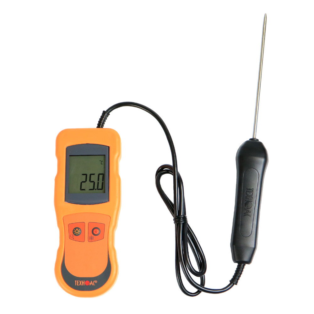 Медный термодатчик контактного термометра ТЕХНО-АС ТК-5.01МС позволяет выполнять измерений в диапазоне температур от -40°С до +200°С. Относительная погрешность при этом составляет ±0,5% + единица младшего разряда равная 0,1°С. Помимо высокой точности при погружных измерениях эта модель дополнена рядом функциональных особенностей: